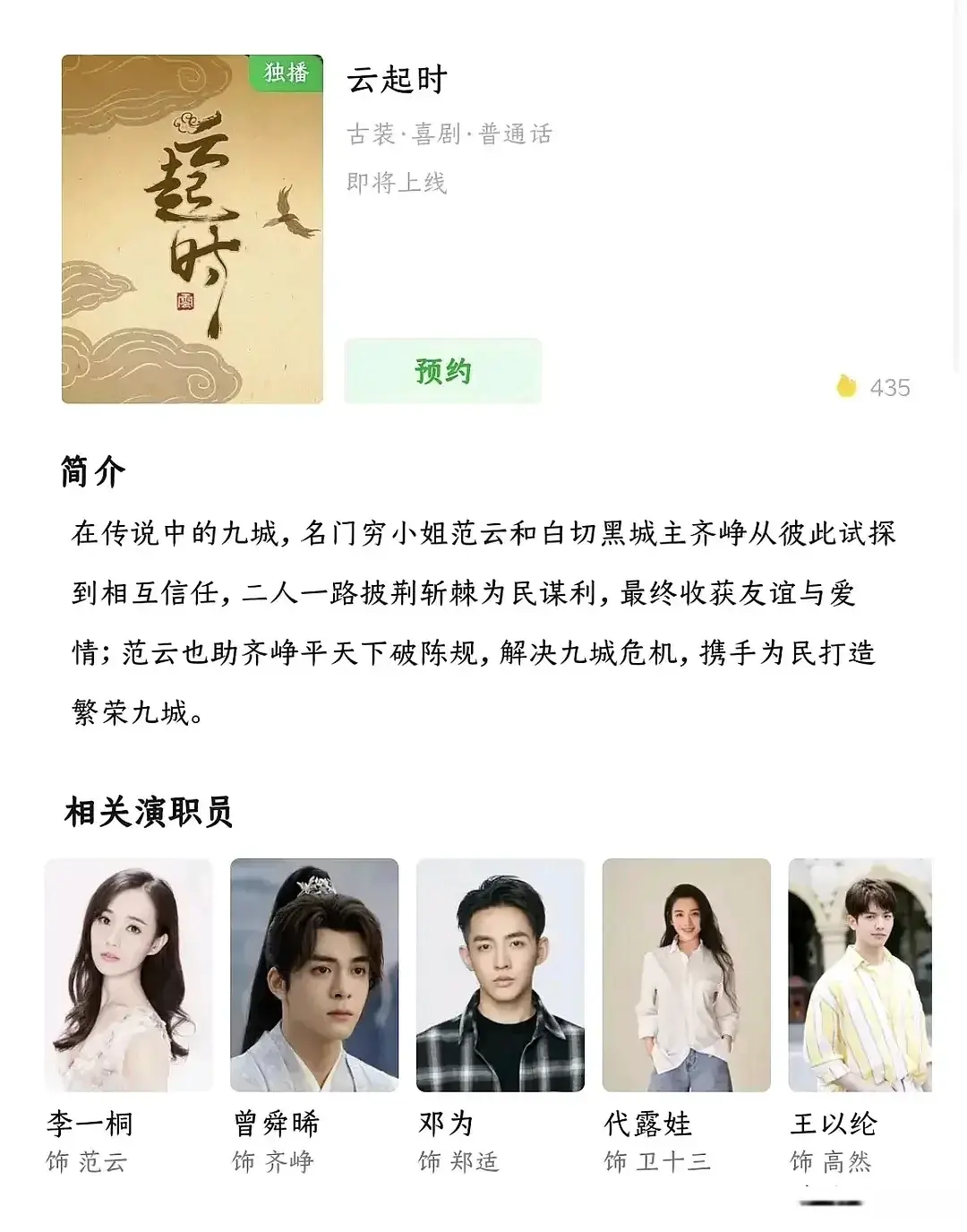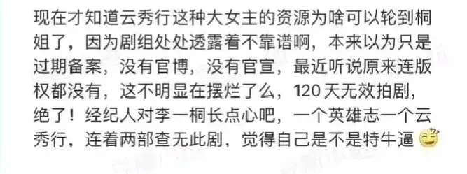 | 由白鹿敖瑞鹏领衔主演的《白月梵星》播出已经过大半了。 让人始料未及的是,率先杀出重围的,会是女二代露娃。  凭借吸睛的演技和带感的人设,代露娃在《白月梵星》中的表现惊艳众人,成为了全剧脱颖而出的存在。  就是说,剧虽然不算火,但对代露娃的加成肉眼可见。  继《长月烬明》的陈都灵后,配角掀桌事件在白鹿这里再次上演……  网友:白鹿这人真旺女二。  对此,还有人总结出了糊花出头捷径:给白鹿当女二。  调侃归调侃,事实就是,代露娃确实凭借茯苓被更多人看到,做到了有效升咖。  而这一飞升,再次印证了《云秀行》演员升咖定律。  是的,代露娃也参演了《云秀行》。 而说起这部《云秀行》,绝对算一个神奇的存在。  该剧在2023年6月初开机,并于同年10月初杀青,至今没有播出迹象。 为什么还没播?两个原因—— 没有版权↓  该剧改编自高人气日本动漫《彩云国物语》,然而据悉并没有购买版权。(还有种说法是版权过期) 没有备案↓  是的,早前就有新闻报道过《云秀行》没有备案,拍摄违规。 这种情况下,可把身为一番大女主的李一桐粉丝气得够呛。  已经有《英雄志》这个前车之鉴,还能在同一个地方摔两次跟头……  李一桐,目前储备了整整5部古偶待播,然而其中有2部都存在违规拍摄现象,能不能播出来都是个问题。  只要拍得多,总有能播的…… 不过对《云秀行》而言,剧虽然不见动静,参演的演员却陆陆续续迎来了身价飞涨—— 邓为 邓为,出生于1996年,中国内地男演员。 在《云秀行》中,邓为饰演男二茶朔洵(已改名郑适)。  《云秀行》开拍时,邓为还是娱乐圈小透明,开拍一个多月后,《长相思》开播,邓为凭借涂山璟迅速走红,成为了新晋流量。  咖位已然实现跨越,不出意外,《云秀行》将成为邓为最后一部古偶男二。 田嘉瑞 田嘉瑞,出生于1998年,中国内地男演员。 在《云秀行》中,田嘉瑞饰演男四李绛攸(已改名颜绛)。  《云秀行》于2023年6月开拍,彼时的田嘉瑞在娱乐圈几乎等同于素人。 同年9月,《云之羽》播出,田嘉瑞凭借宫远徵走进大众视野,打响知名度的同时圈了不少粉。  作为郭敬明的力捧对象,田嘉瑞升咖速度很快,后面还参加了《花少6》这种热门综艺刷脸。  作为近两年才冒头的新人,新剧已经和鞠婧祎曾舜晞陈都灵这些圈里前辈平番了。 代露娃 代露娃,出生于1997年,中国内地女演员。 在《云秀行》中,代露娃饰演女二蓝十三姬(已改名卫十三)。  开拍时,代露娃还是圈里小透明,开拍后,随着《长相思》和《白月梵星》的播出,地位已然今非昔比。 《长相思》实现了大热剧刷脸,而《白月梵星》则实现了暴风吸粉。  内娱95花再添一员。  在《云秀行》配角团齐刷刷升咖的同时,主演同样没落下。 李一桐 李一桐,出生于1990年,在《云秀行》中饰演女主红秀丽(已改名范云)。  这位一直被称为捧不红的资源咖,哪怕主演了《狂飙》这样的大爆款,仍旧是最没存在感的女主,热度被女配高叶碾压。 然而,2023年下半年开始,李一桐的热度逐渐上来了。  不是因为作品出圈,而是因为在综艺《女子推理社》中,和田曦薇一起吸引了不少cp粉入坑。  “桐心薇泯”,内娱目前最大势的百合cp。  参加大型活动时,主办方会特地把两人安排在一起。  事实证明,利益捆绑有一定效果,两人都有吃到红利,话题度不断,李一桐再也不是那个被娱乐圈忽视的边缘人。 曾舜晞 曾舜晞,出生于1997年,在《云秀行》中饰演男主紫刘辉(已改名齐峥)。  近年来被爱奇艺买股,拿下《孤舟》等大饼,资源提升肉眼可见。 值得一提的是,曾舜晞还是目前唯一一个把“沁系三姐妹”合作了个遍的男星。  缘分实属不浅。  除了李一桐的撞脸对象们,曾舜晞还和李一桐的cp搭子田曦薇合作过。  兜兜转转,《云秀行》的玄学还在持续中。 开拍时籍籍无名,开拍后全员热度水涨船高。  只是,演员阵容含金量越高,越替这剧可惜。 目前《云秀行》为了顺利播出所做出的应对之策: 更改剧名↓  更改角色名↓  想和原著切割的心呼之欲出……  从早早放出片花至今未播来看,欲盖弥彰,并没什么成效。 福兮祸所依,《云秀行》,一部多多少少有些奇葩的剧集。